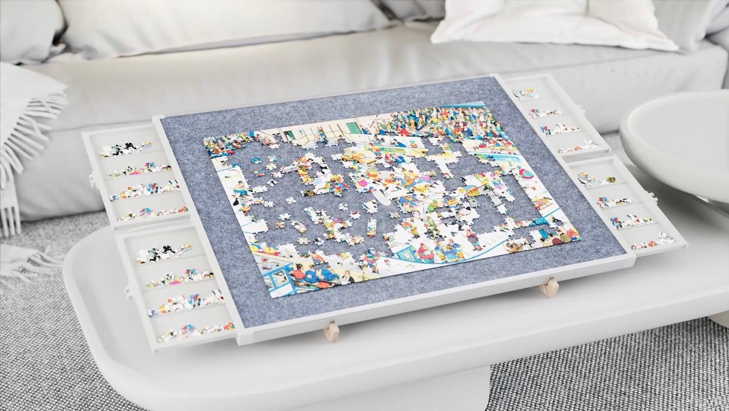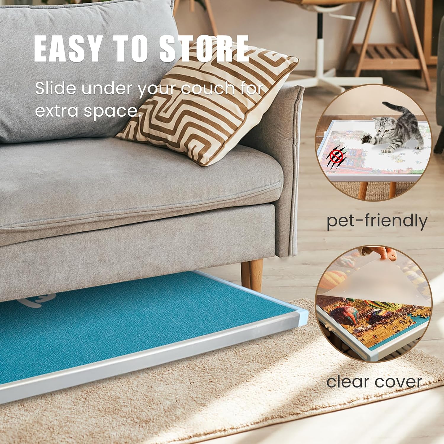 The large yet lightweight jigsaw puzzle board for 1500 pieces with a cover can keep safe from pets and dust. Slide this portable puzzle board under your couch for extra space. Easy to transport and store.