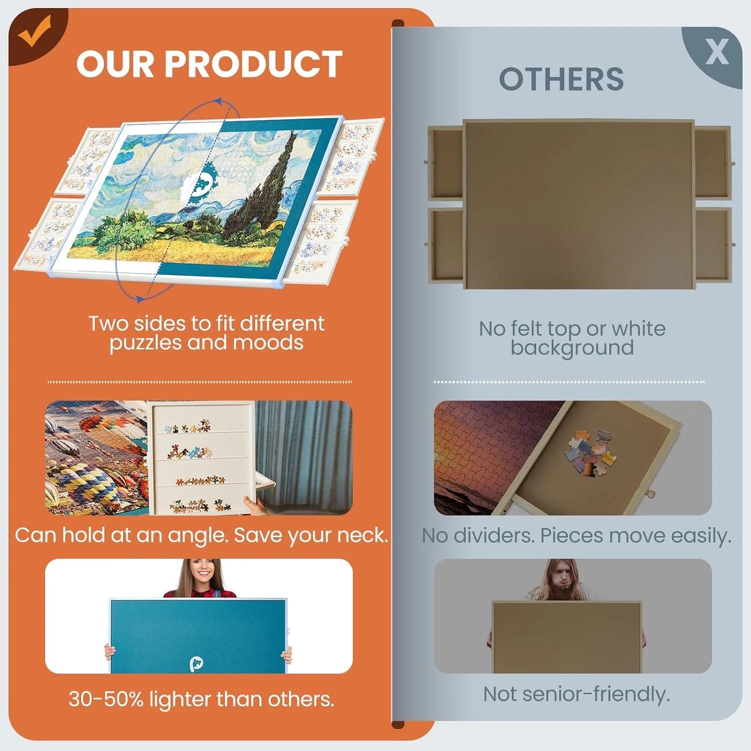 This Dual-Sided puzzle board with drawers featuring with a large white Smooth surface and a Felt surface. This portable puzzle board also comes with a Lazy Susan to rotate, a tilt stand and a clear cover mat.